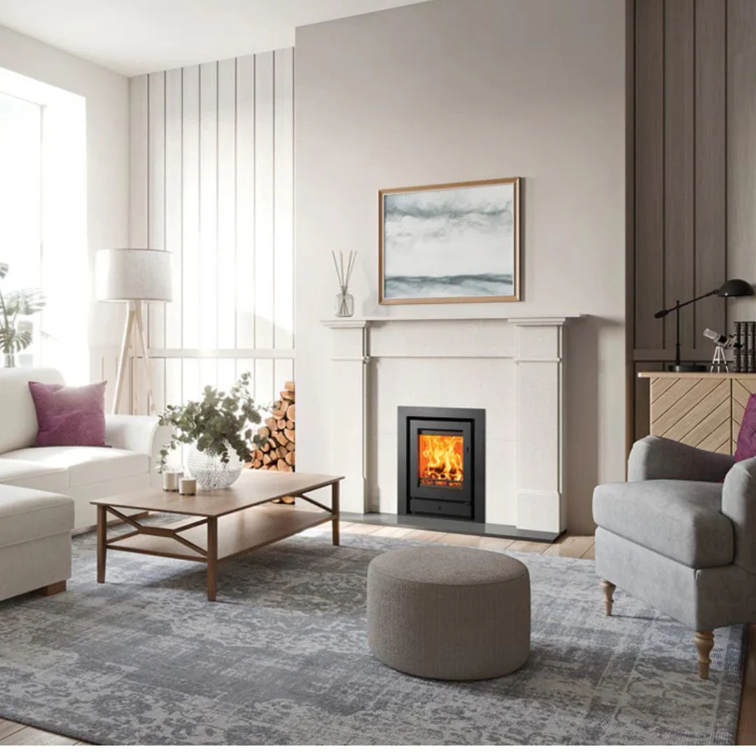 The Ecodesign Stovax Riva2 40 is a high-efficiency wood-burning and multi-fuel cassette stove, designed to fit seamlessly into a standard 22-inch high by 16-inch wide British fireplace opening with the chairbrick removed. This allows for installation with minimal building work, often without the need to modify an existing hearth or mantel.